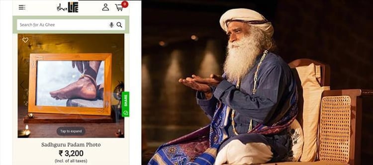 On the Isha Life e-shop, a snapshot of its founder’s foot is advertised for ₹3,200. Sadhguru's feet "are revered because they are the pathway to access the Guru's energy," according to the product description. The description states that the photo of Sadhguru's feet comes in a "beautiful wood frame" and serves as "a powerful medium to strengthen your connection with Sadhguru," adding that "the very act of bowing down to a Guru's feet enhances one's proximity and builds a deeper connection with the Guru."