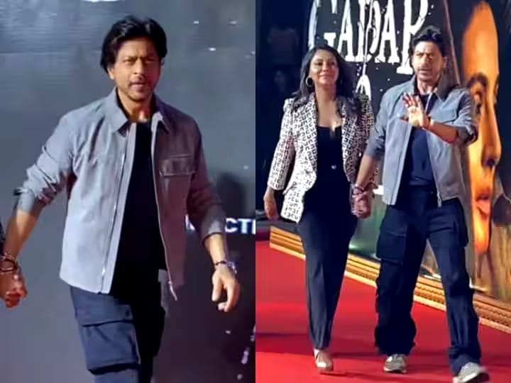 Sunny Deol hosted a grand party on saturday on the success of his film 'Gadar 2'. During this time, when veteran bollywood stars like Anil Kapoor, Jackie Shroff, and anupam kher participated, shahrukh khan also attended the party. Let us tell you that the talks between sunny deol and shahrukh khan were stopped for a long time. Shahrukh Khan reached Sunny Deol's party with his wife Gauri Khan. During this, he was seen holding his wife's hand. king Khan was seen wearing a gray jacket with a black t-shirt and black trousers, while gauri khan was also seen wearing a printed blazer with a black outfit.