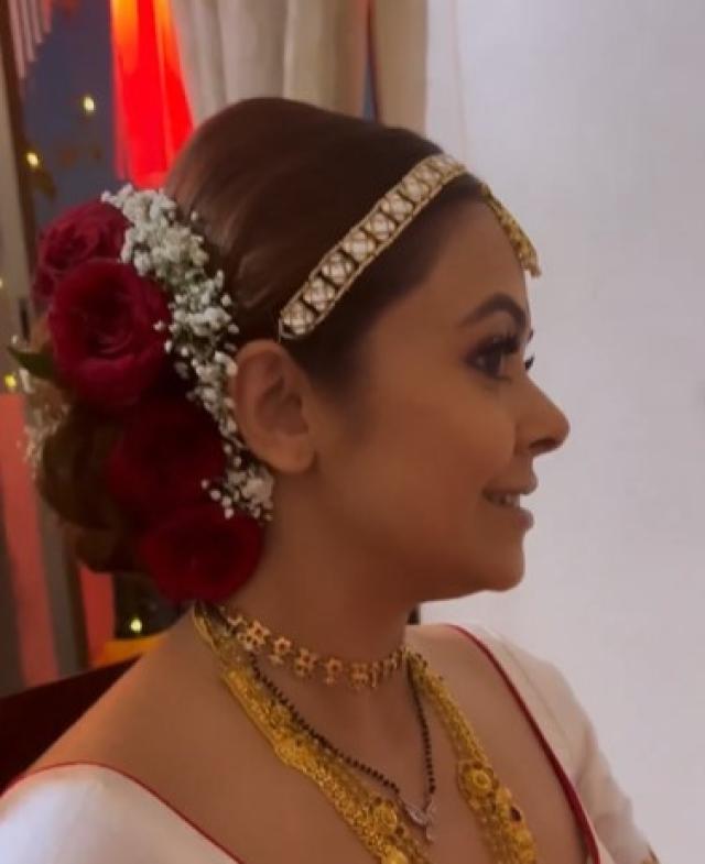 Along with this, she has also worn a shakha pola in her hands and a statement matha patti. In the video, devoleena is seen flaunting her mangalsutra. Devo's unique hairstyle also grabbed everyone's attention. She has styled her hair in a bun, which has been decorated with roses and white flowers.