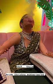 krishna Mukherjee's pre-wedding ceremonies began on 11 march 2023 with a fun-filled Mehendi ceremony. For the event, the actress was decked up in a green lehenga with silver embroidery on the vest. She styled it with a strappy blouse that had beautiful floral embroidery all over it. The bride was seen enjoying hookah while getting henna applied on her hands. At the same time, the couple was twinning in white outfits in Haldi.