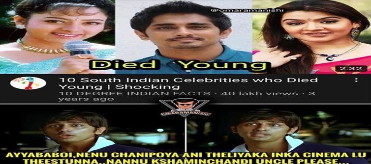 అసలు ఏం జరిగిందంటే, ఇటీవల యుక్తవయసులో చనిపోయిన పది మంది సౌత్ ఇండియన్ సెలబ్రిటీలు అని రాసి ఉన్న వీడియో థంబ్ నెయిల్ ఫోటోను కోడ్ చేస్తూ ఒక నెటిజన్ సోషల్ మీడియాలో సెటైరిక్గా పోస్ట్ చేశాడు. ఆ థంబ్ నెయిల్పై హీరోయిన్లు సౌందర్య, ఆర్తి అగర్వాల్తో పాటు హీరో సిద్ధార్థ ఫోటో కూడా ఉంది. దీనిపై సిద్ధార్థ్ వ్యంగ్యంగా స్పందించినట్లుగా పోస్ట్ను తయారు చేశారు. "అయ్య బాబోయ్, నేను చనిపోయా అని తెలియక ఇంకా సినిమాలు తీస్తున్నా.. నన్ను క్షమించండి అంకుల్ ప్లీజ్" అంటూ సెటైరికల్గా రాసి సోషల్ మీడియాలో చేసిన పోస్ట్ బాగా వైరల్ అయింది.