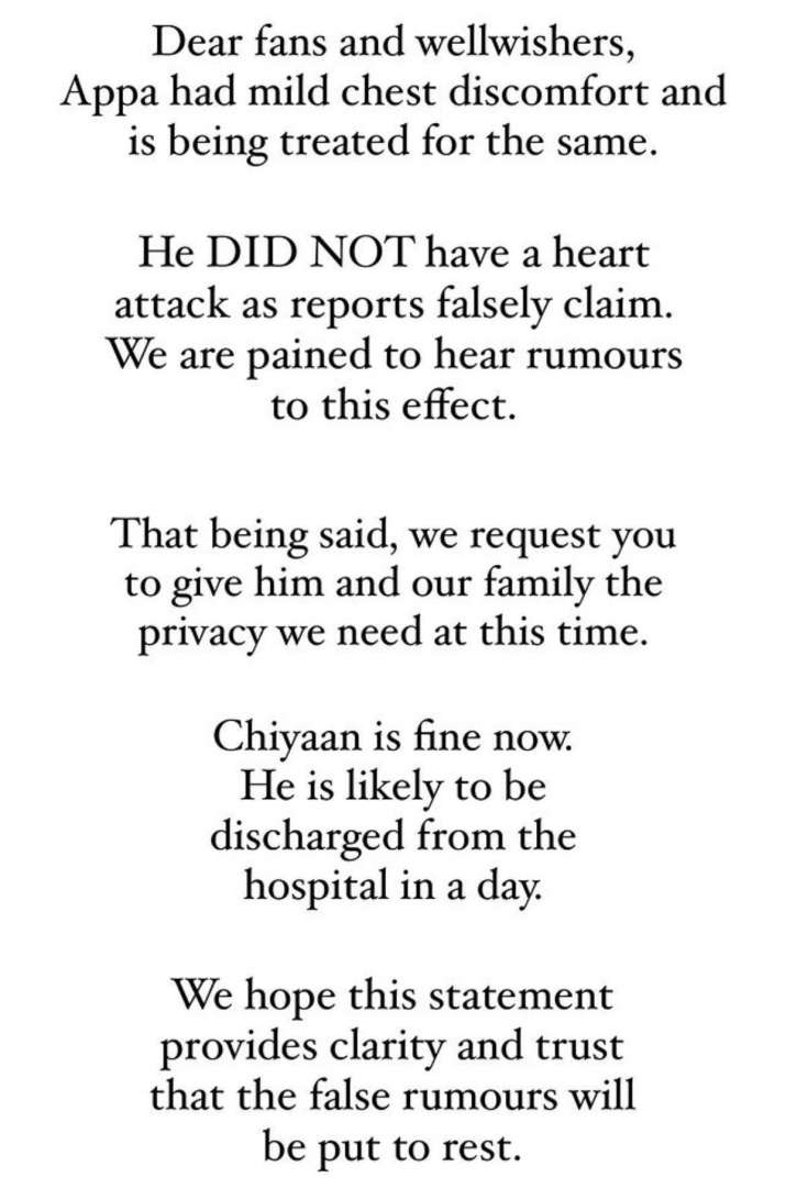 Giving Vikram's health update on Instagram, dhruv wrote, "Dear fans and well-wishers, Appa had mild chest problem and is being treated. He did not suffer a heart attack. The reports of heart attack in the media are false. We are saddened to hear such rumours. We request you to give us and our family the privacy that we need at this time." dhruv further said, "Chiyan is fine now. We hope this statement will put an end to all those false rumours."