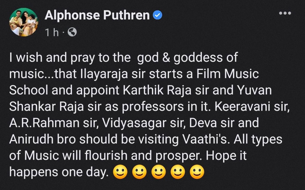 He now wants music composer ilayaraja to start a music school and Ilayaraja's music school has famous composers Keeravani, AR Rahman, Vidyasagar, Deva, along with composers karthik raja and yuvan shankar raja as professors.