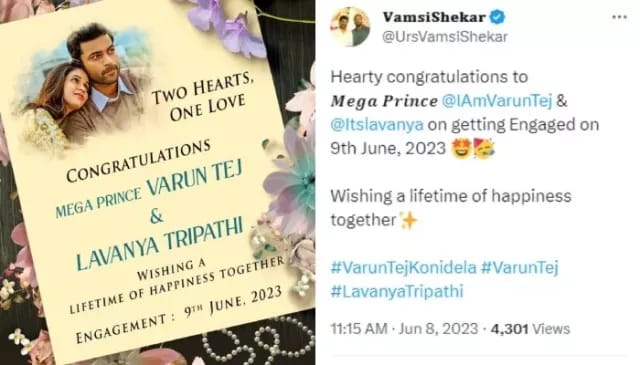 Meanwhile, on 8 june 2023, popular telugu publicist duo Vamsi-Shekhar has announced the news of varun and Lavanya's engagement on their twitter handle. Sharing a glimpse of the actors' engagement invitation card, Vamsi-Shekhar wrote, "Mega princes @IAmVarunTej and @Itslavanya getting engaged on 9th june 2023. Wishing them a lifetime of happiness."