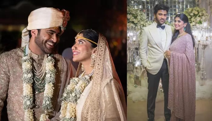 Marriage of sharwanand and rakshita ReddyTelugu actors sharwanand and rakshita reddy were married according to South indian customs at the Leela Palace in Jaipur. On her wedding day, sharwanand wore a pastel pink sherwani, paired with a matching dupatta and ivory colored turban. Wearing a necklace of green beads, sharwanand looked no less than a prince. Whereas, his bride completed her South indian bridal look with a cream colored saree, heavy necklace, maang tikka, golden bracelets and subtle makeup. Click here to see the wedding photos .