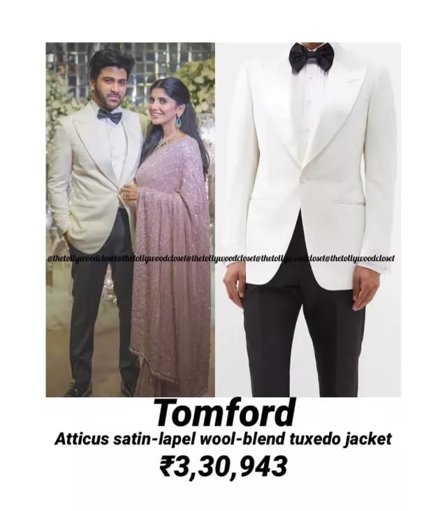Sharwanand , a well-known actor of the South Film Industry, had a grand wedding on 3 june 2023 with his lady love rakshita reddy in Jaipur. Six days after the wedding, the couple hosted a wedding reception party for their celeb friends and close ones on june 9, 2023, in which 'RRR' star ram charan and many big personalities graced their presence. Glimpses of the reception of telugu actors sharwanand and rakshita reddy are going viral on social media. While new bride rakshita looked gorgeous in a beautiful pink sequinned saree for her special day, sharwanand looked dapper in black pants, white shirt and cream tuxedo. However, the cost of Sharva's tuxedo may surprise you. Sharwanand wore a tuxedo worth 3.31 lakhs in his receptionThere is no doubt that sharwanand looked handsome in his reception look. However, it is the cost of his tuxedo that caught our attention. In fact, according to a picture shared by a fashion insta page named 'the tollywood closet', Sharwanand's cream colored 'Tomford' tuxedo, which looks very elegant and classy in appearance, is worth Rs 3,30,943. comes with a price.