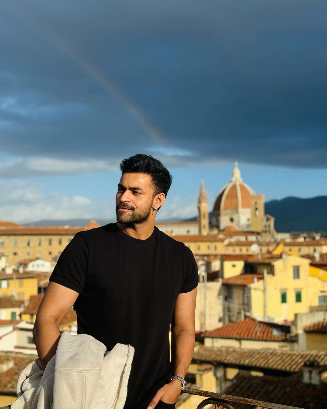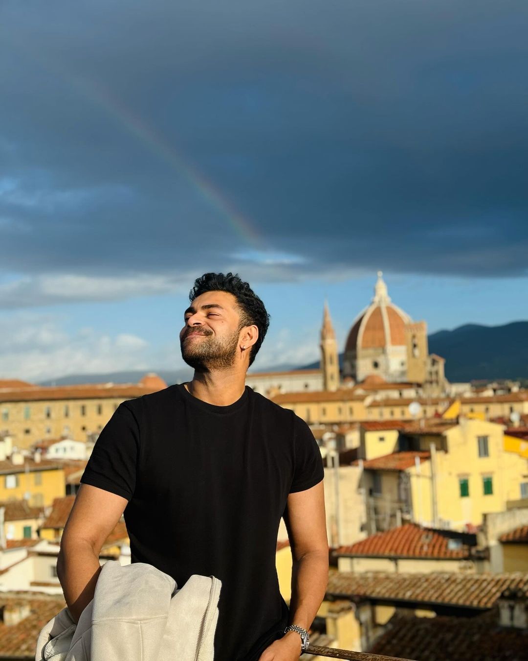 Apart from Varun's solo photos, these photos also feature beautiful photos of varun spending quality time with his bride Lavanya Tripathi. The snaps flashed on varun as he was in a blissful mood with his lady love. Varun's pleasant smile and the beautiful rainbow in the background is not to be missed. Along with varun and Lavanya, the mega team has already arrived at the venue in Tuscany.