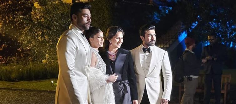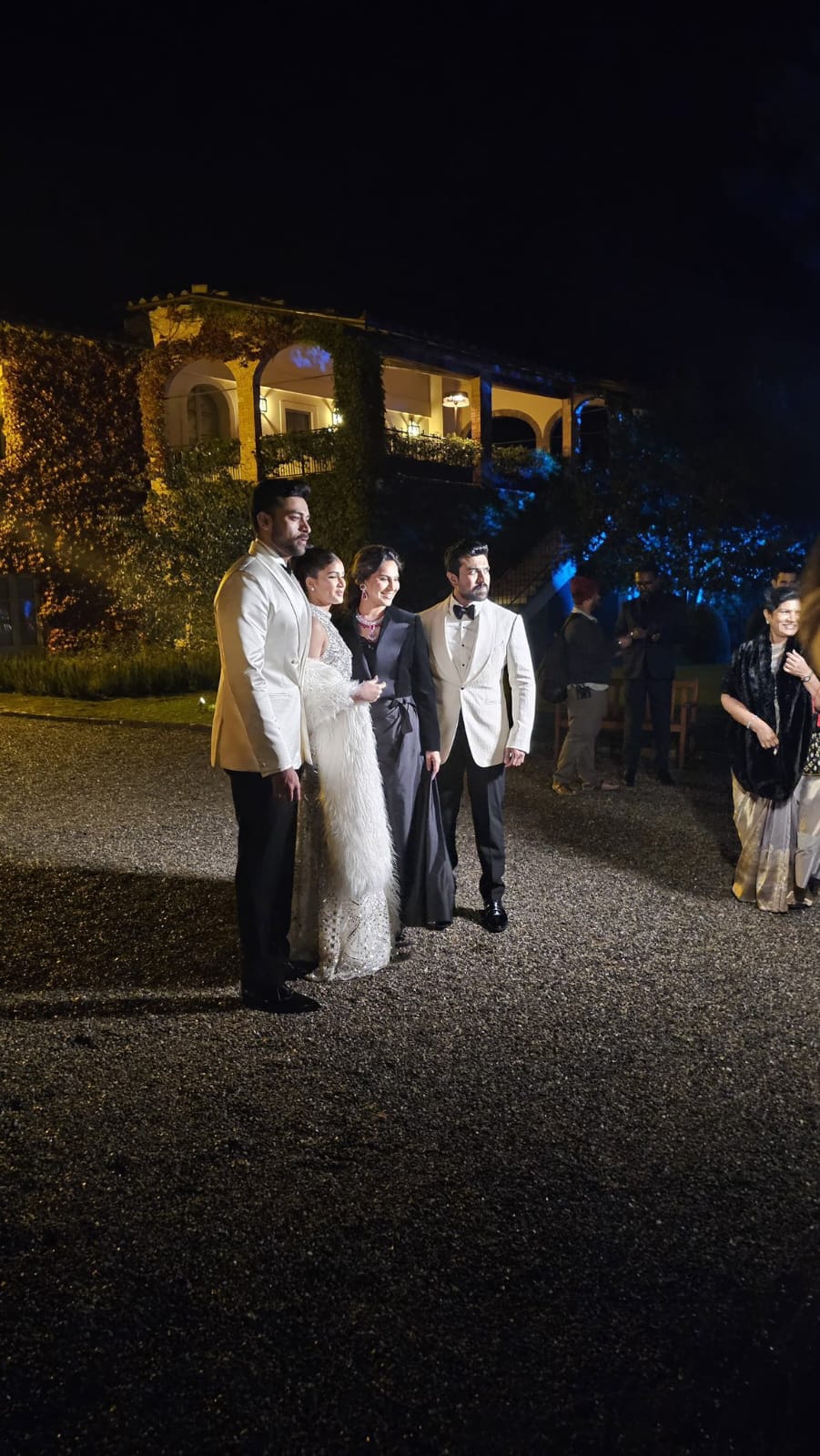 Four people posed for the camera during the party in the garden in the evening. varun and Charan are seen in the same designer outfit. In black and white combination clothes, the two brothers are attractively in focus. And upasana dressed in black designer clothes.