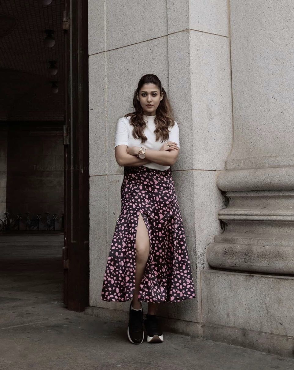 Nayanthara showed off one leg in a slit cut skirt paired with a plain high-neck blouse, looking lovely and comfortable at the same time. She looked really stunning in it.