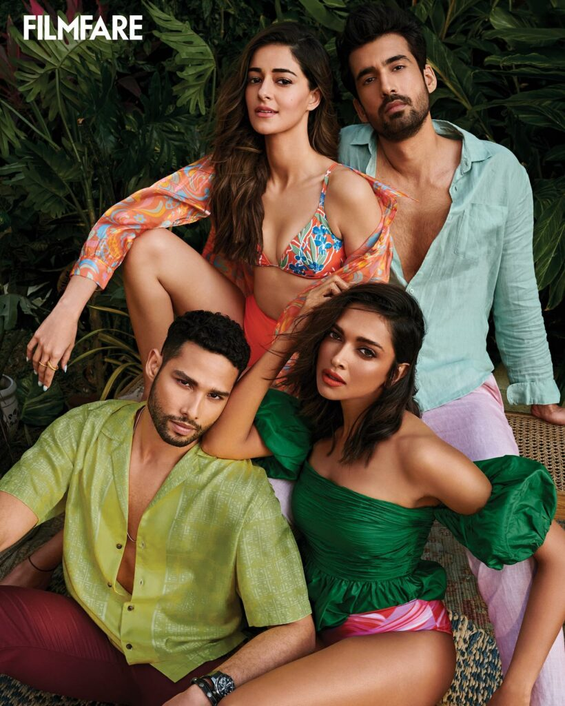 In a maroon lacy bralette and a satin slit skirt with pleated ruffles on the waistband, ananya further persuaded us that she is certainly a lovely doll. deepika also wears black and white bikinis to show off her tanned complexion. Her beauty options for the day were matte lips and a dewy base for the duo. The cast demonstrated how to look great in playful, casual, and flirty clothing.