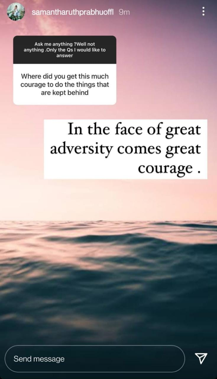 Samantha responded, "I spotted this on the way to the airport... It wasn't planned... I got enthusiastic and went for it... "A sick beat." "Where did you find this much guts to undertake the things that are kept behind?" a fan asked the Theri singer. "Enormous courage comes in the face of great adversity," samantha said. She also revealed on how courageous she is to take risks after the breakup.