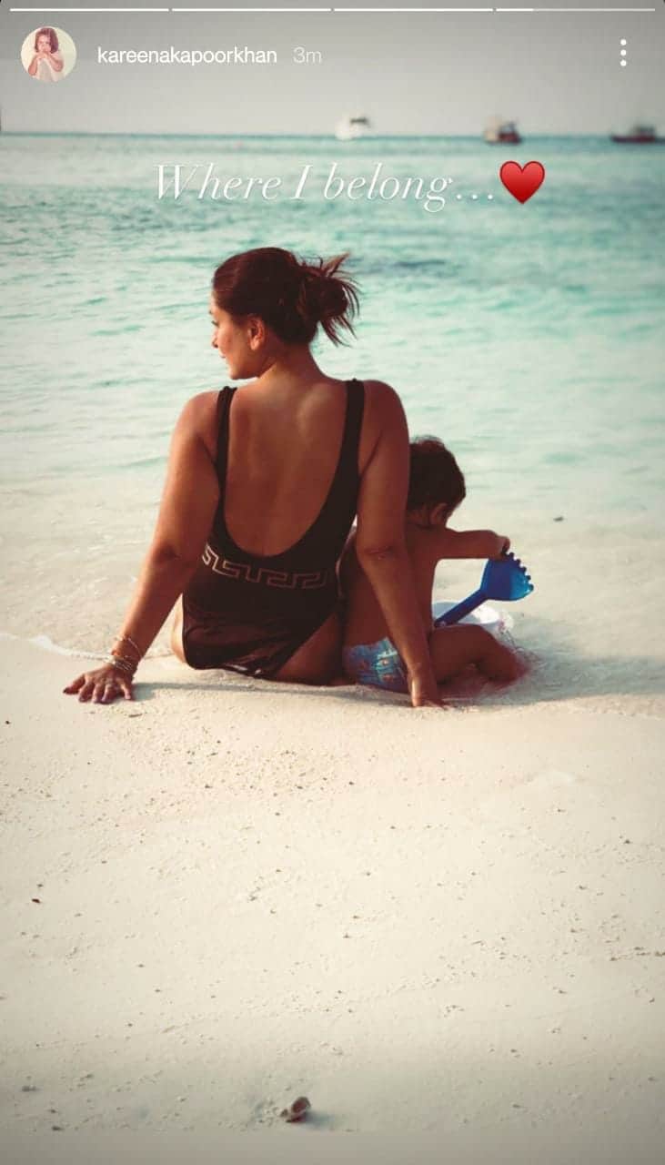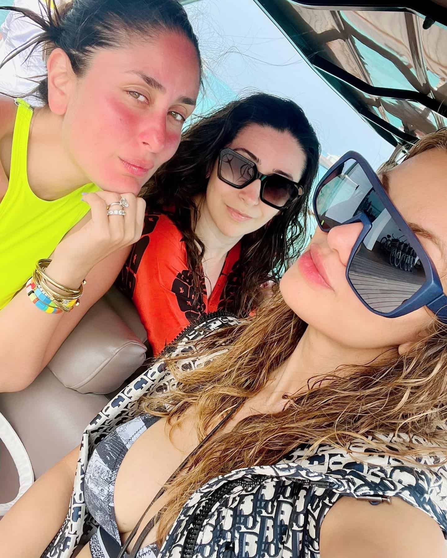 "I'm happiest when I'm near the sea." A day of diving, talking, delicious food, and posing with my girls and their lovely babies (of course). natasha commented, "Reminder to #wearyoursunblaock! @kareenakaapoorkhan." Kareena is dressed in a yellow monokini, while Karismaa is in a black bikini. natasha wore a Dior bikini with sunglasses as well. By the poolside, they posed together just like divas. She also posted a video of the delectable goodies enjoyed by Kareena, Karisma, and their children Taaimur ali Khan, Kiyaan, and others during their maldives vacation.