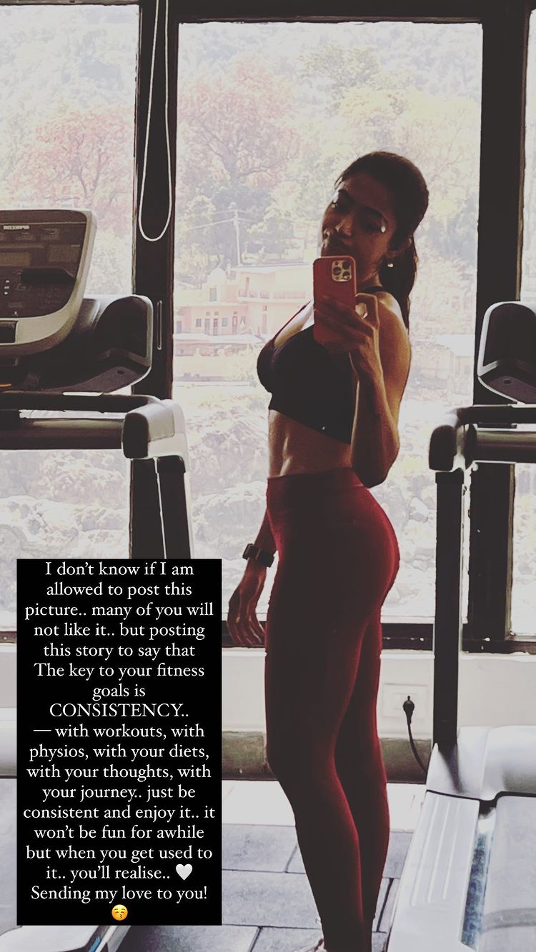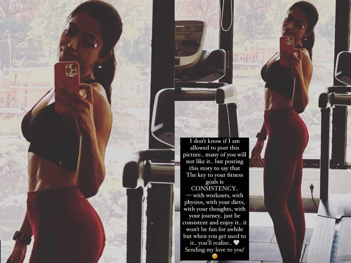 Rashmika is seen standing in front of a mirror selfie in a gym picture she published on her instagram stories lately. The actress showed off her toned back in a black crop top and red tights. But it was her message, as much as the image, that truly struck a chord. We can totally relate to what she's saying and couldn't agree with her more. "I'm not sure if I'm permitted to upload this photo... Many of you will not like it, but I'm sharing this story to emphasise the importance of CONSISTENCY in your fitness goals: in your exercises, with your physios, in your meals, in your thinking, in your trip... Just keep it consistent and have fun with it... It won't be fun at first, but as you get used to it...you'll see... I'm sending you my best wishes!" reads the text of her message