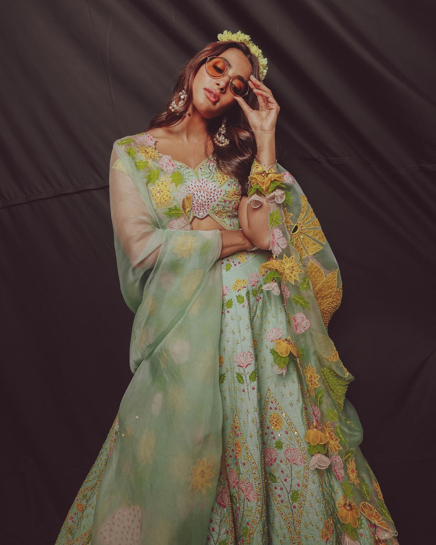 Pooja Hegde accessorised her appearance with pearl earrings and a yellow artificial flower hair piece. The flower headband completed the desi look with a lovely touch. Her outfit was complemented by dewy makeup and a bright smile. pooja Hegde's yellow and blue flowery lehenga is ideal for a pre-wedding celebration. The radhe shyam actor ups her game by wearing yellow tint sunglasses and casting a spell. Is it a yes or a no? Please share your thoughts in the comments box below.
