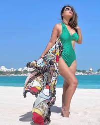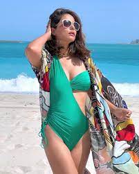 Hina Khan, posing by the seaside, is wearing a green color monocony. Whose one-shoulder design is making it attractive? On the other hand, criss-cross detailing has been done. With which Hina has carried a stole of multicolor print. Taken from the collection of Shivan & Naresh, Hina is seen in a killer look as always in this monocony.