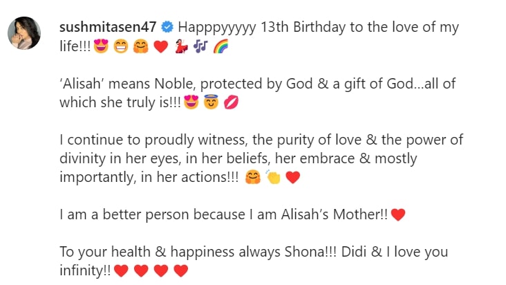 Sushmita wrote in the caption, "Happy 13th birthday to the love of my life. Alisa means great, protected by God, and a gift of God, who you really are. I proudly witness the purity of love and power of His Look in the eyes. Divinity is seen in their actions." She further wrote, "I am a better person because I am Alisa's mother. Shona, you always stay healthy and happy. Didi and I love you very much.