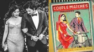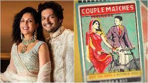 Now let's talk about Richa and Ali's wedding invitation card, which is very unique in appearance. Actually, on 21 september 2022, we got a wedding invitation for ali and Richa's wedding on a paparazzi instagram page. The card, designed by a friend of the couple, is in the shape of a matchbox. It has a sketch of the faces of ali and Richa, who are seen riding a cycle in traditional attire. This wedding card of Richa and ali is giving a retro feel of the 90s. It is written on it 'Couple Matches'.