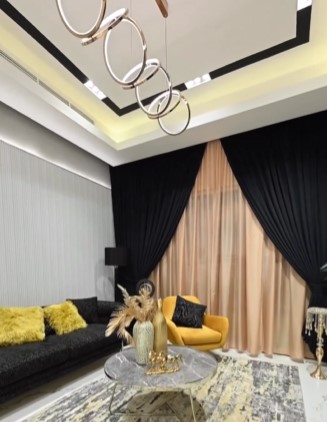 There is a very spacious drawing area in the house, which is very beautiful to see. There is a black sofa in this area, on which cushions of yellow and blue color are placed. There is a table in front, on which a big flower pot is kept. White walls give a stunning look to the house.