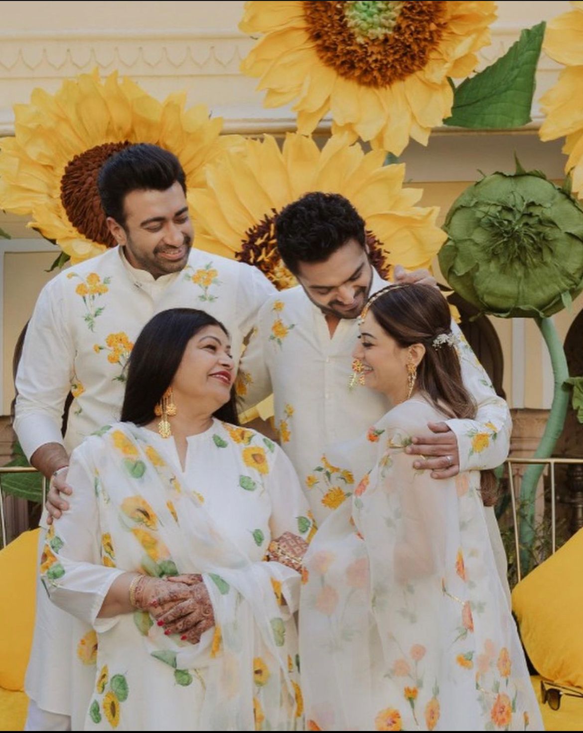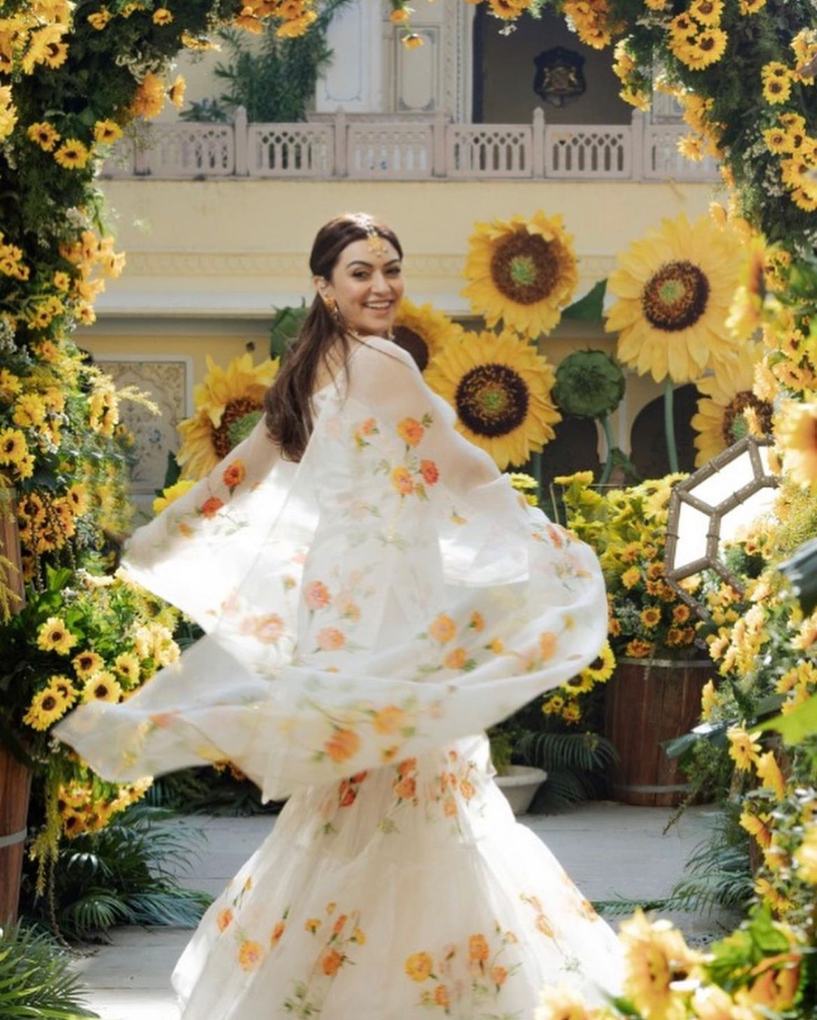 Talking about Hansika's look for the ceremony, she looked gorgeous in a beautiful white kurta with yellow floral prints all over. She paired her outfit with a matching sharara and an organza dupatta. To complete her look, Hansika had chosen a beautiful set of statement jewelery which matched perfectly with her dress.