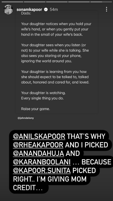sonam kapoor reshared a post from an insta page on her instagram story. The post was dedicated to dads, asking them to treat their wives well as their daughters notice their actions. Sharing the post on her insta story, Sonam tagged her father anil kapoor and revealed that it is because of him that she and her sister rhea kapoor chose the right partner in their lives. Giving credit for marrying the best man to her mother Sunita Kapoor, Sonam said, "@ANILSKAPOOR so @RHEAKAPOOR and I chose @ANANDAHUJA and @KARANBOOLANI....because @KAPOOR.SUNITA chose right...I am the mother." Giving credit to..."