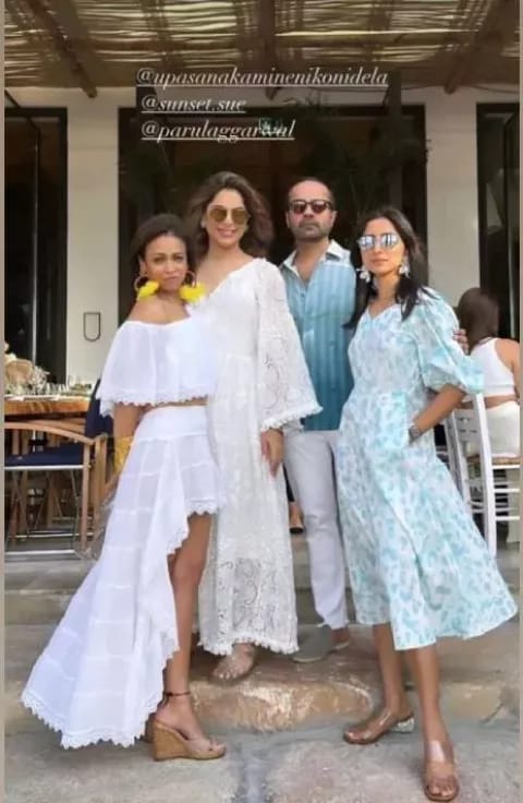 For the ceremony, upasana Kamineni wore a white lace work maxi dress and flaunted her baby bump in the cutest way. Keeping her look minimal, she styled it with tinted sunglasses and flat sandals. The mom-to-be was channeling her pregnancy glow as she posed for the cameras with her friends.