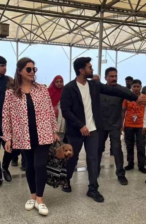 When upasana Kamineni and ram charan left for DubaiOn march 30, 2023, ram charan and his wife upasana Kamineni were seen in their casual, yet stylish outfits as they left for Dubai. For the outing, ram looked cool in a white T-shirt and black shirt and matching pants. upasana, on the other hand, radiated her pregnancy glow in a plain black top and matching jeggings and teamed it up with a white shirt with red cherry print.