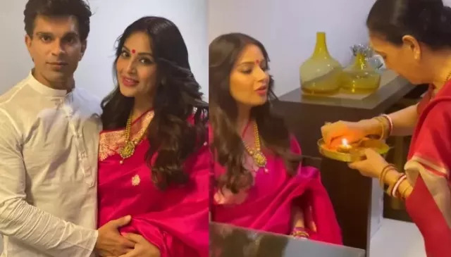 Bipasha wore a vibrant pink silk sari for the baby shower ceremony ('shaadh' in Bengali) hosted by her mother. Bipasha looked lovely in a traditional look with golden jewellery, open hair, minimal makeup and bindi. On the other hand, her husband karan Singh Grover matched her in a cream colored kurta-pyjama. Click here to see the video.