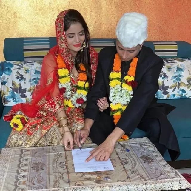 Pictures of gehna Vashisht and Faizan Ansari's marriage are becoming increasingly viral on the Internet. In this, Gehana dressed in red lehenga is seen with her husband Faizan. Faizan is wearing black kurta pajama and white cap. He is seen signing the marriage papers. Both are looking like a perfect couple together. The happiness of Nikah can be clearly seen on their faces.