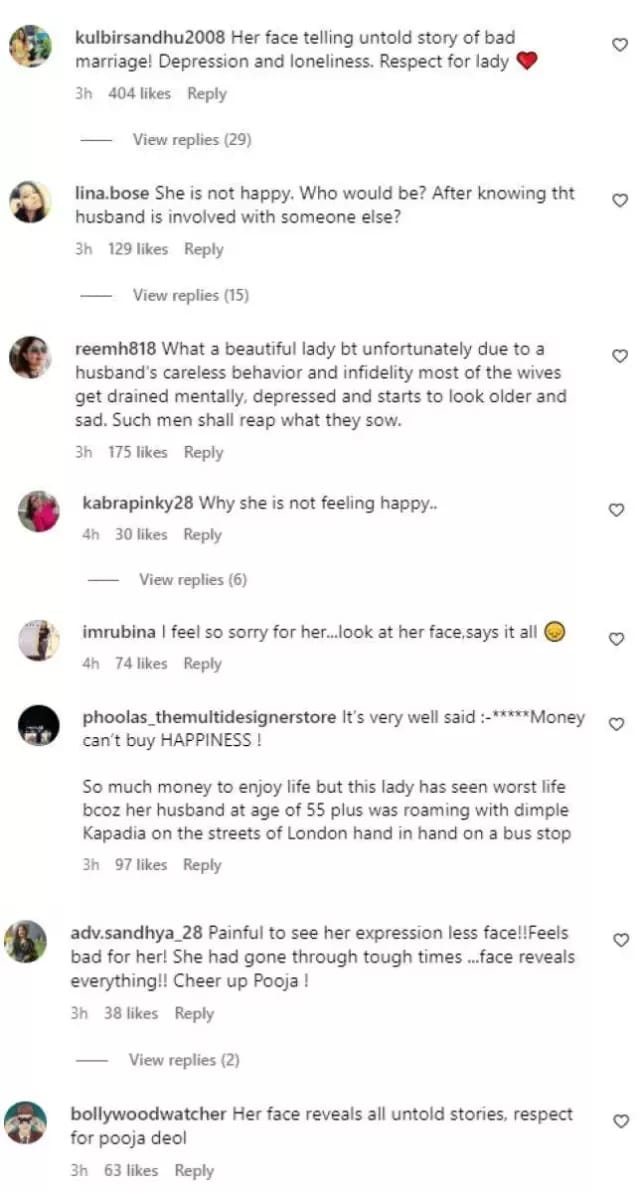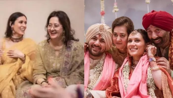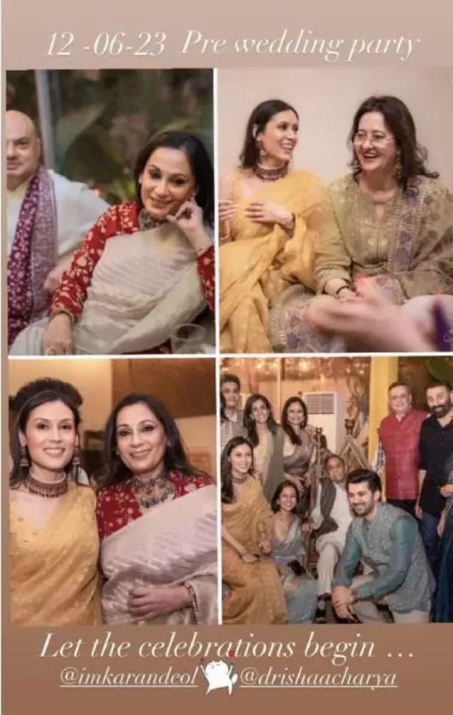 Sunny Deol's Samdhan shared a happy photo with pooja Deol, netizens said she was sad at her son's wedding Recently, unseen happy pictures of his mother pooja Deol from karan Deol's wedding surfaced and fans are in awe of her candid moment with daughter-in-law Drisha Acharya. Let us show you.Actor Sunny Deol's son karan Deol and his girlfriend Drisha acharya had a dreamy wedding on june 18, 2023 in the presence of their friends and family. However, as soon as some rare pictures of Karan's mother pooja Deol surfaced, her fans got worried and said that she looked sad at her son's wedding. Well, meanwhile a happy photo of pooja Deol has been shared on social media and we loved their candid moment. Happy photo of pooja Deol from karan Deol's wedding On 22 june 2023, Drisha Acharya's mother Chimu acharya shared a photo collage of her daughter's pre-wedding festivities on her insta story. The glimpses showed some unseen glimpses of the celebrations and the Deol-Acharya family looked very happy together. However, it was pooja Deol's picture which grabbed everyone's attention. While she looked unhappy in all the old pictures from the wedding, in the latest pictures she was seen laughing her heart out as the cameras clicked her in a candid moment. Sharing the picture, Chimu wrote, "12-06-2023 Pre-wedding party. Let the celebration begin. Unseen pictures of pooja Deol from son karan Deol's weddingEarlier, we came across some pictures of pooja Deol posing with newly married couple karan Deol and Drisha acharya at their wedding festivities. While in the first picture sunny deol and pooja Deol were seen posing with their sons karan and Rajveer, in the second picture Sunny and pooja were seen hugging the newly married couple. However, as soon as the pictures surfaced online, netizens pointed out that pooja Deol did not look happy at her son karan Deol's wedding. While some social media users took a dig at Sunny Deol's alleged affair with dimple kapadia and attributed it to Pooja's unhappiness, others claimed that she was unhappy with her son karan Deol's marriage. Reacting to the viral pictures, a user wrote, "What a beautiful woman, but unfortunately most of the wives get mentally exhausted, depressed and look old and dejected due to husband's careless behavior and infidelity." Such men reap what they sow." Another commented, "Sad to see his expressionless face!! Feel bad for them! She had gone through tough times, face tells it all!! Keep pooja happy!'' See user reactions here. Unseen pictures of pooja Deol from son karan Deol's wedding Earlier, we came across some pictures of pooja Deol posing with newly married couple karan Deol and Drisha acharya at their wedding festivities. While in the first picture sunny deol and pooja Deol were seen posing with their sons karan and Rajveer, in the second picture Sunny and pooja were seen hugging the newly married couple. However, as soon as the pictures surfaced online, netizens pointed out that pooja Deol did not look happy at her son karan Deol's wedding. While some social media users took a dig at Sunny Deol's alleged affair with dimple kapadia and attributed it to Pooja's unhappiness, others claimed that she was unhappy with her son karan Deol's marriage. Reacting to the viral pictures, a user wrote, "What a beautiful woman, but unfortunately most of the wives get mentally exhausted, depressed and look old and dejected due to husband's careless behavior and infidelity." Such men reap what they sow." Another commented, "Sad to see his expressionless face!! Feel bad for them! She had gone through tough times, face tells it all!! Keep pooja happy!'' See user reactions here. Who is karan Deol's fiancee Drisha Acharya? With the Deol family keeping the identity of their daughter-in-law-to-be under wraps, fans were curious to know about the beautiful lady who stole karan Deol's heart. Please tell that Drisha is the great-granddaughter of the great filmmaker Bimal Roy. Karan's fiancee is settled in Dubai, where she works as a manager in a travel agency. Her father's name is sumit acharya and her mother is Chimu acharya , who is a wedding planner and stylist by profession