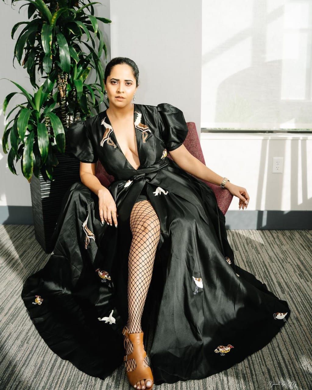 This time she entertained by doing a cleavage show as well as thighs show. It shines more beautifully in black color. But, remarkably, she is not wearing a bra in this dress. Thighs also wore netted pants. Her skin looks clear in it. Fans and netizens are getting upset after seeing Anasuya's pics. Going viral with likes and comments.