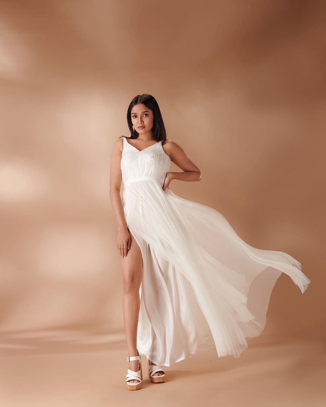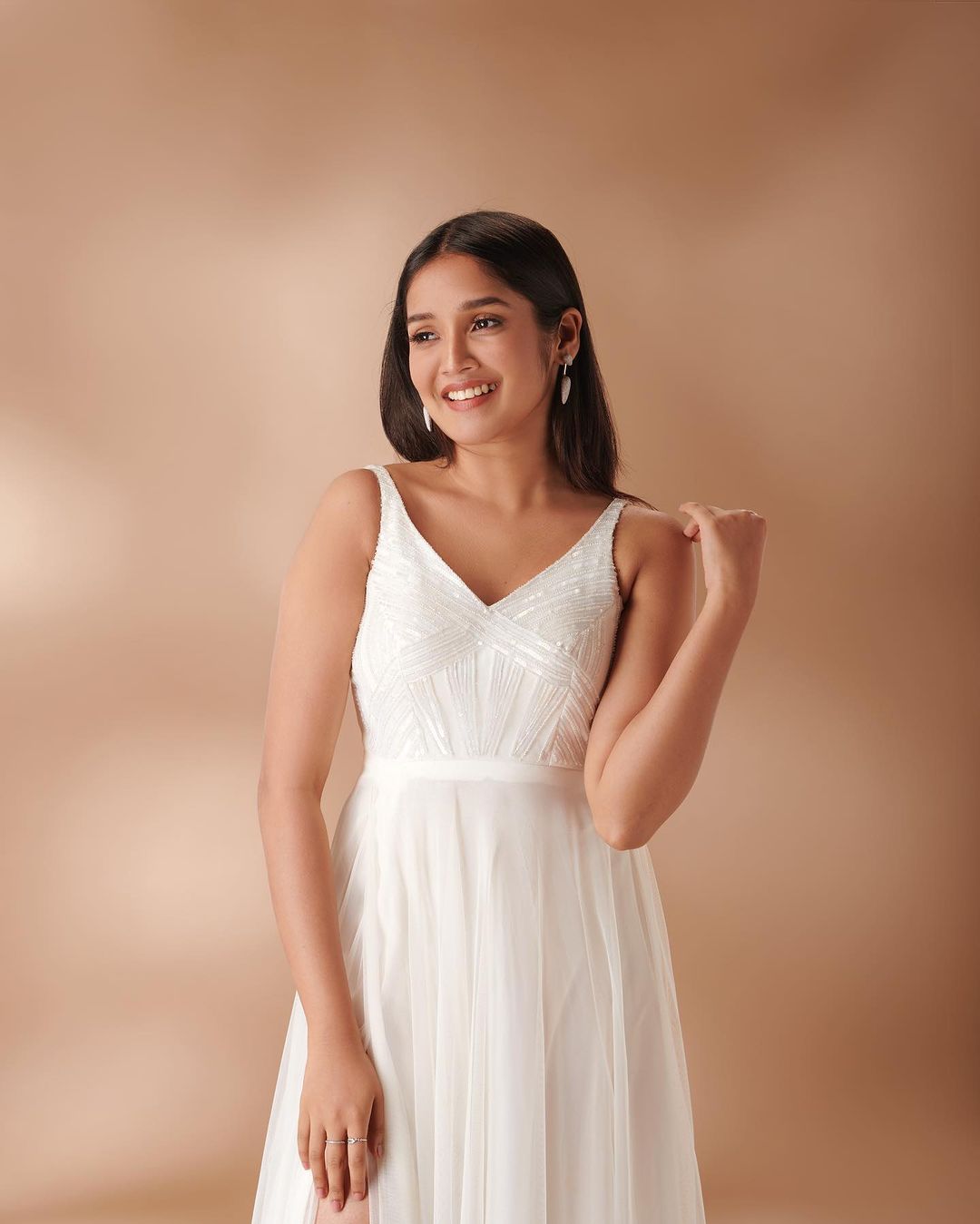 Here she is dressed in a white sequined gown. Anika's skin tone is the same colour. On that beauty looks more attractive in gown. A cute smile brightened the face. Hair style, makeup and earrings make the lady more beautiful focus. Now this photo has gone viral. Boys are falling in love with Anika's beauty. They are posting comments saying that our heart has slipped.