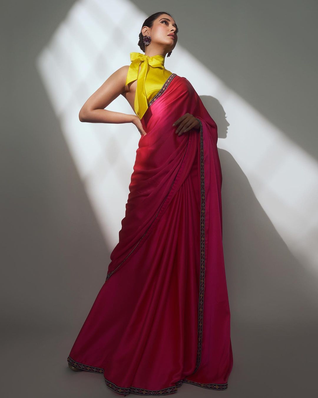 Tamannaah shines like the queen of the fashion world with a neon-infused look. Stepping on the red carpet, tamannaah dazzled in a neon yellow sheer halter neck blouse. The neon pink silk saree is praised for its bold fashion sense with the combination of neon shades. The neon yellow halter neck blouse not only enhances the grace of tamannaah but also brings out the uniqueness in the traditional saree.