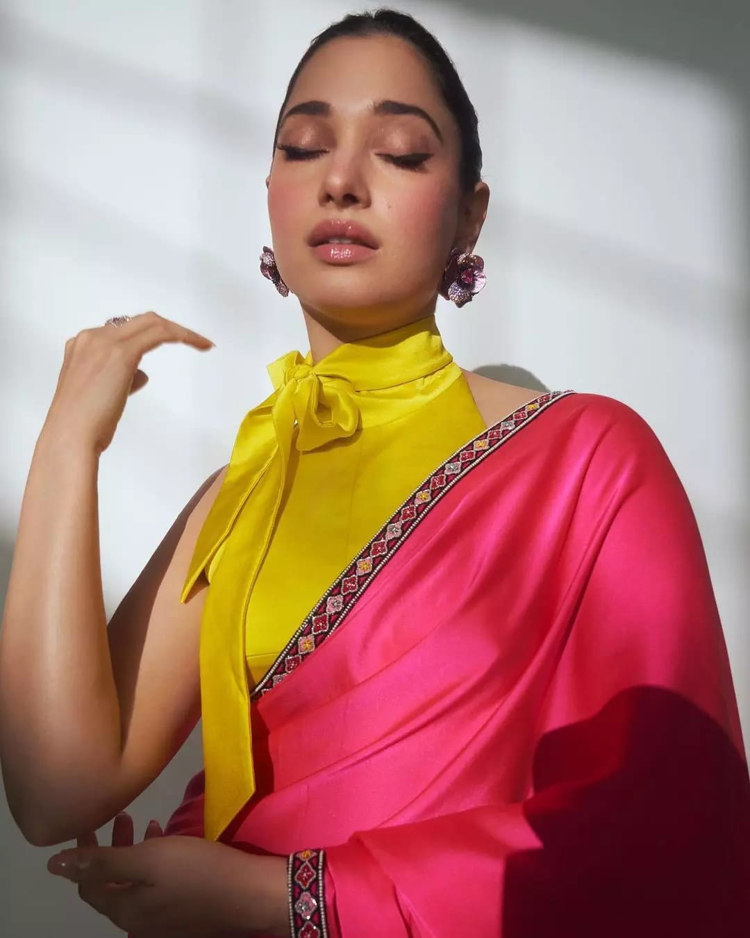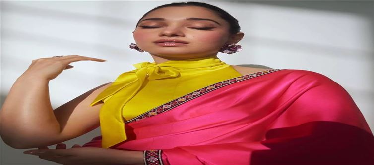 Fans are praising this as a bold choice. There is no doubt that a look like this will be a head turner at the event. A neon pink silk saree flaunts her elegance beautifully. Some even comment that this is the only fashion choice that young fashionistas cannot ignore. Tamanna's natural beauty and attractive eyes were the main highlight in this photoshoot. A bold vibrant pink gloss on the lips that compliments the chosen saree adds extra appeal.