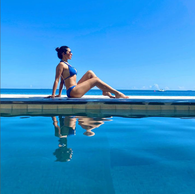 Posed gracefully beside the sea, a swimming pool complements her elegance, with shades of blue from the sky, sea, pool, and her bikini creating a visually striking spectacle. The photo, saturated with various hues of blue, aligns seamlessly with the prevailing trend in beachwear fashion, showcasing her ongoing influence in the glamour world.