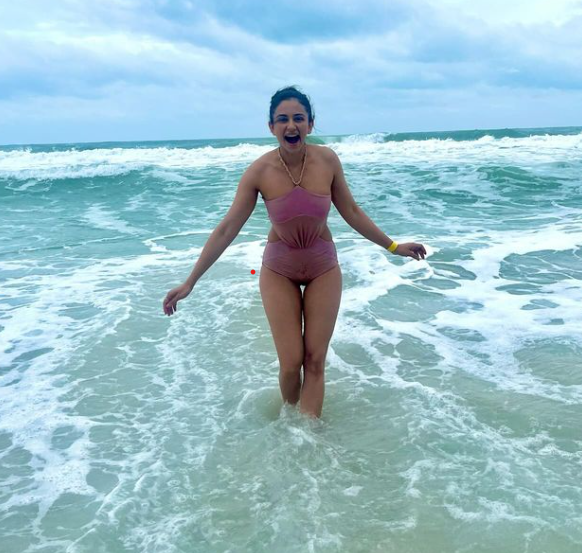 Amid her busy schedule, rakul takes the time to unwind and recently shared captivating photos from her vacation. In one of the pictures, she can be seen wearing a dark pink swimsuit, enjoying the beach despite the cool climate. rakul expressed her love for the destination, earning praise from fans.