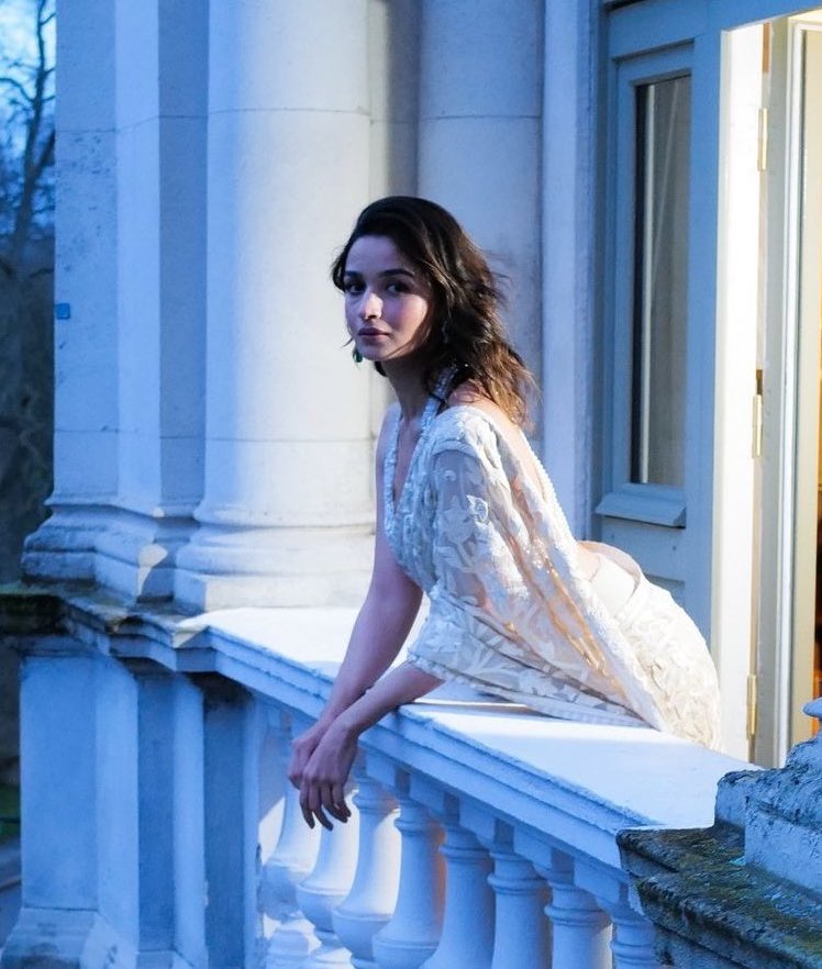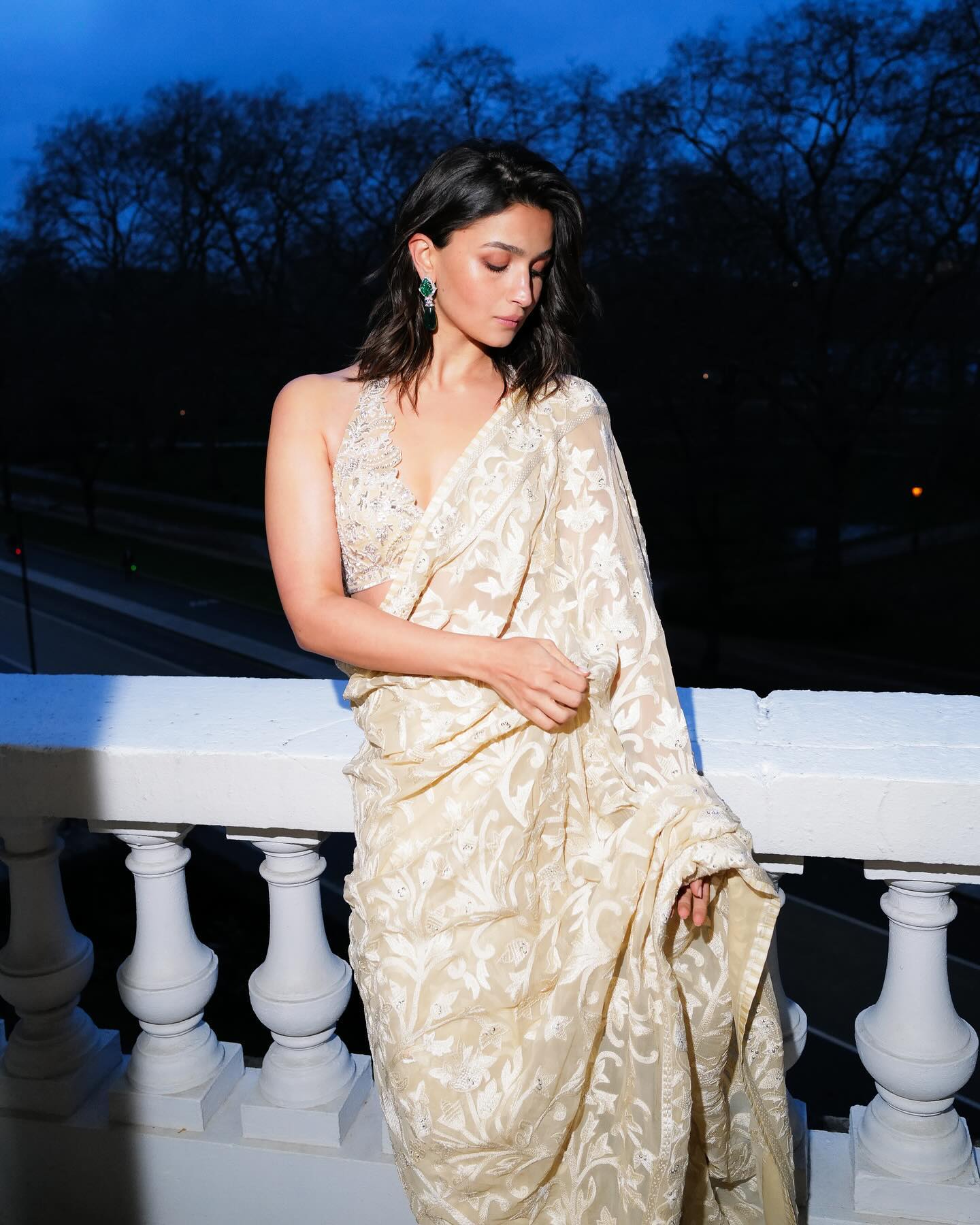 Crafted from ivory flower silk and intricately embroidered with various stitches, the saree exuded timeless beauty and craftsmanship. Its design, reminiscent of a bygone era, added a touch of nostalgia and grandeur to Alia's ensemble. Paired with her natural charm and beauty, the saree became a symbol of exquisite elegance and refinement.