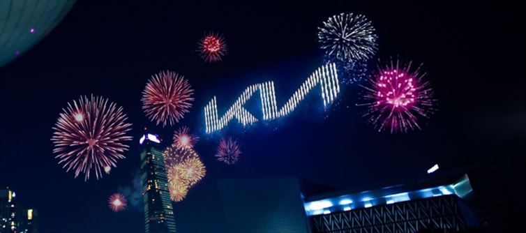 ऑटोमोबाइल कंपनी ने उन्नत तकनीक का उपयोग करके अपने लोगो और नए ब्रांड स्लोगन को लॉन्च करने के लिए इसे बड़े पैमाने का उपयोग किया। किआ मोटर्स द्वारा अपने पेज पर साझा किए गए एक YouTube वीडियो में, किआ ने अपने नए लोगो और ब्रांड स्लोगन का अनावरण करते हुए ड्रोन लाइट शो के साथ पाइरोड्रोन और पटाखों का उपयोग किया।