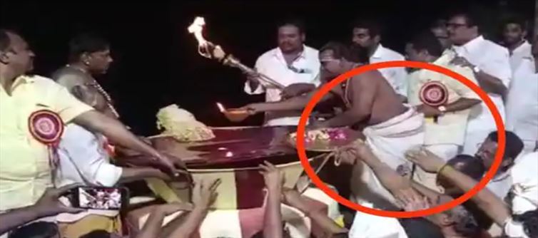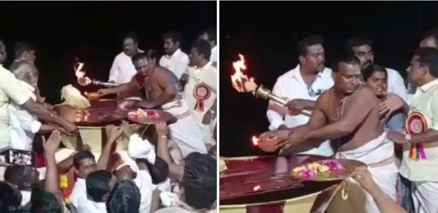 Meanwhile, there was a competition between the temple priest Karthigai with the lamp and the executive officer Karthigai with the fire band to light the lamp. Then when the temple priest Karthika was about to light the lamp, the Periyakulam assemblyman grabbed the priest's robe and pushed him back. Finally, the temple priest took the lamp held by OP Jaya pradeep and lit the Kartika Deepam. Enraged by this, Thanga Tamilchelvan, Periyakulam assembly member Saravanakumar, and DMK members got involved in an argument between the OPS party and then left the place in a rage. Later speaking to the people present there, Jayapradeep shouted furiously that the DMK was engaging in such activities for political reasons and that the people and god would take care of them. Following this, AIADMK coordinator O. Panneerselvam came to the Kailasanathar temple and poured a jug of ghee in the pot where the Karthigai Deepam was lit and worshiped the Karthigai Deepam and then had darshan of Kailasanathar Sami. Due to this argument between the OPS family and the DMK during the lighting of the Karthigai Deepam, the Karthigai Deepam was lit late at 7 o'clock, causing inconvenience to the devotees.