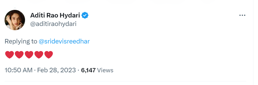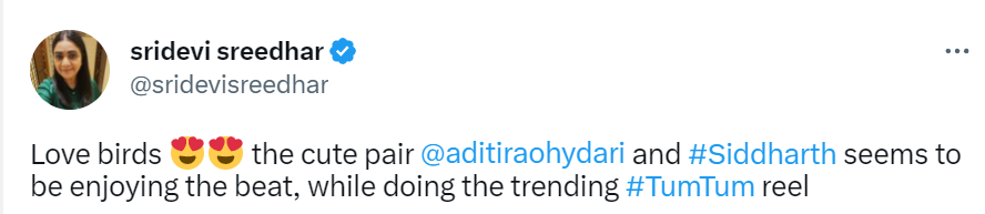 When someone referred to aditi rao hydari and siddharth as "lovebirds," she responded. She responded to the remark with "red hearts," inferring their relationship inadvertently. Although neither Aditi nor siddharth have explicitly acknowledged their relationship, they have always been able to drop hints that frequently make headlines. Rumors of aditi rao hydari and siddharth dating each other have circulated in the headlines since last year.