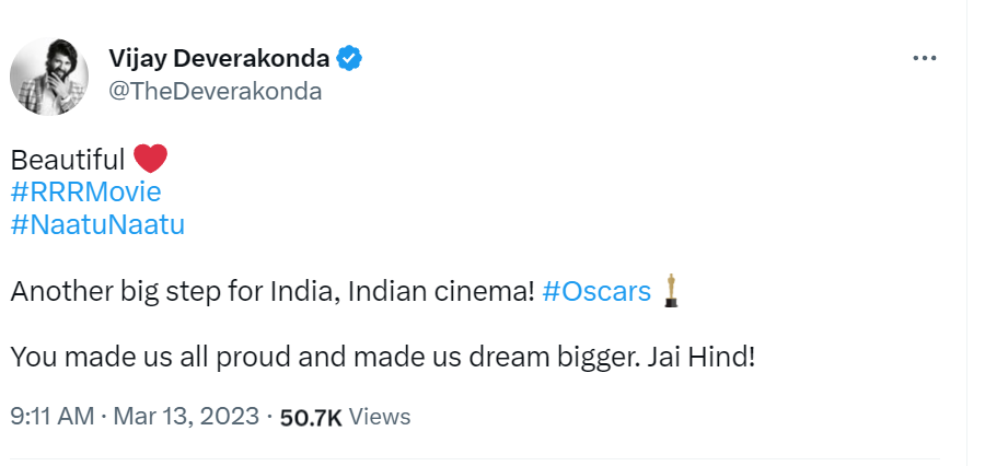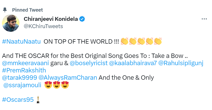 Fatherly pride chiranjeevi is ecstatic that rrr, which stars his son ram charan in the starring role, won the Oscars in 2023. The megastar responded to the major news on social media by writing, "Without One Man's vision, fortitude, and conviction @ssrajamouli, the #Oscars would still remain a dream for India. A Billion Hearts Overflowing with Pride & Appreciation! Bravo to each and every member of the @RRRMovie Superb Team."