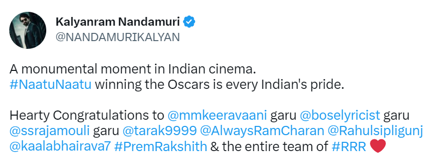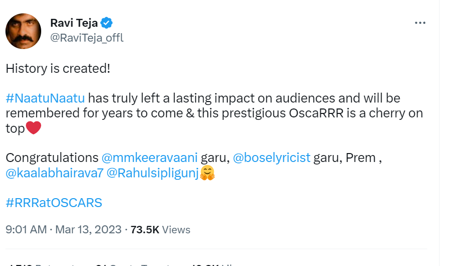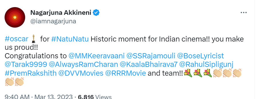 When the Naatu Naatu was named the Best Original Song winner, fans and celebrities lit up the internet. A number of famous people, like Rana Daggubati, priyanka Chopra, and others, watched the Oscars live and commented on Naatu Naatu's stunning win. indians take great pride in this legendary event.