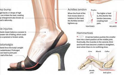 If you are a perennial high heel wearer, this could eventually spell spider veins. Walking in heels also stiffens your Achilles tendons, which anchor your calf muscles to your heels, causing your calves to bunch up. If you have had your tall pumps on all day, you might have trouble walking naturally when your first kick off your kicks. You can work to offset this stiffness by flexing your feet shoe less for several times throughout the day.