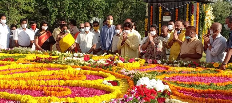 దివంగత ఎన్టీఆర్ జయంతి వేడుకలు లాక్ డౌన్ కారణంగా నిరాడంబరంగా జరుగుతున్న వేళ, హిందూపురం ఎమ్మెల్యే, నటుడు నందమూరి బాలకృష్ణ, హైదరాబాద్ లోని ఎన్టీఆర్ ఘాట్ వద్ద కొద్దిసేపటి క్రితం నివాళులు అర్పించారు. ప్రస్తుతం తెలుగు రాష్ట్రాల్లో కరోనా వైరస్ ప్రభావం ఉండటం వల్ల సామాజిక దూరం, మాస్క్ తప్పనిసరి అయ్యింది. ఈ నేపథ్యంలో ఎన్టీఆర్ ఘాట్ వద్ద ఈ నియమాలు పాటిస్తూ అభిమానులు వచ్చారు. ఇక నందమూరి బాలకృష్ణ, ఆయన సతీమణి వసుంధరా, ఎన్టీఆర్ తనయులు రామకృష్ణ తదితరులు ఎన్టీఆర్ ఘాట్ వద్ద నివాళులు అర్పించారు.