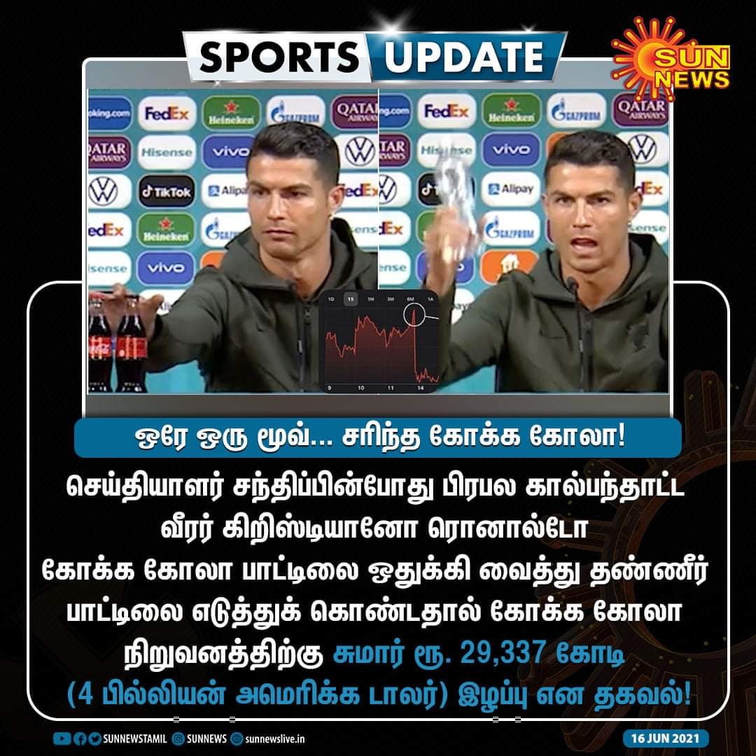 The Power of CR7 even outside the field seems to be huge as Coca-Cola company faced a huge drop in their stock market prices and the company has suffered a loss of Rs.29,337 Crores due to the one move done by Cristiano Ronaldo during the press conference. We reported that CR7 moved the Coca-Cola bottles which were placed before him and he asked everyone to drink water instead.
