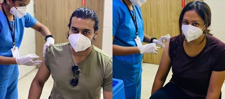 Actor Suriya along with his wife jyothika got their first dose of vaccine today at a private hospital in chennai and actor Suriya revealed that with a tweet and shared the photos along with the same tweet. Suriya was looking dapper in a loose t-shirt with shades hanging between the tee while jyothika was also wearing a similar loose tee and was keeping a casual hairstyle and came to get jabbed.