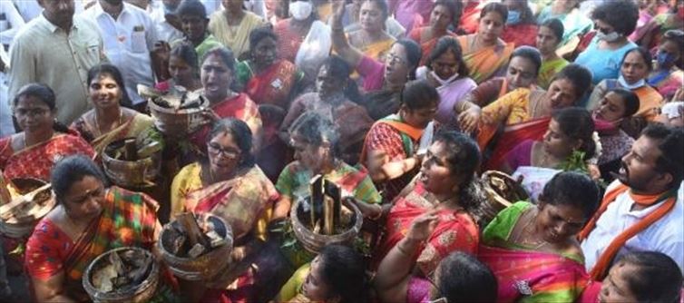 Women brandishing matches and flinging wasps took part in the demonstration, which was headed by coimbatore South mla Vanathi Srinivasan. They also hoisted placards that read, "Tasmag is permitted to open," "Schools are allowed to open," and "Temples are not allowed to open." They also vented out slogans against the ruling DMK government and demanded temples should be opened 24/7.