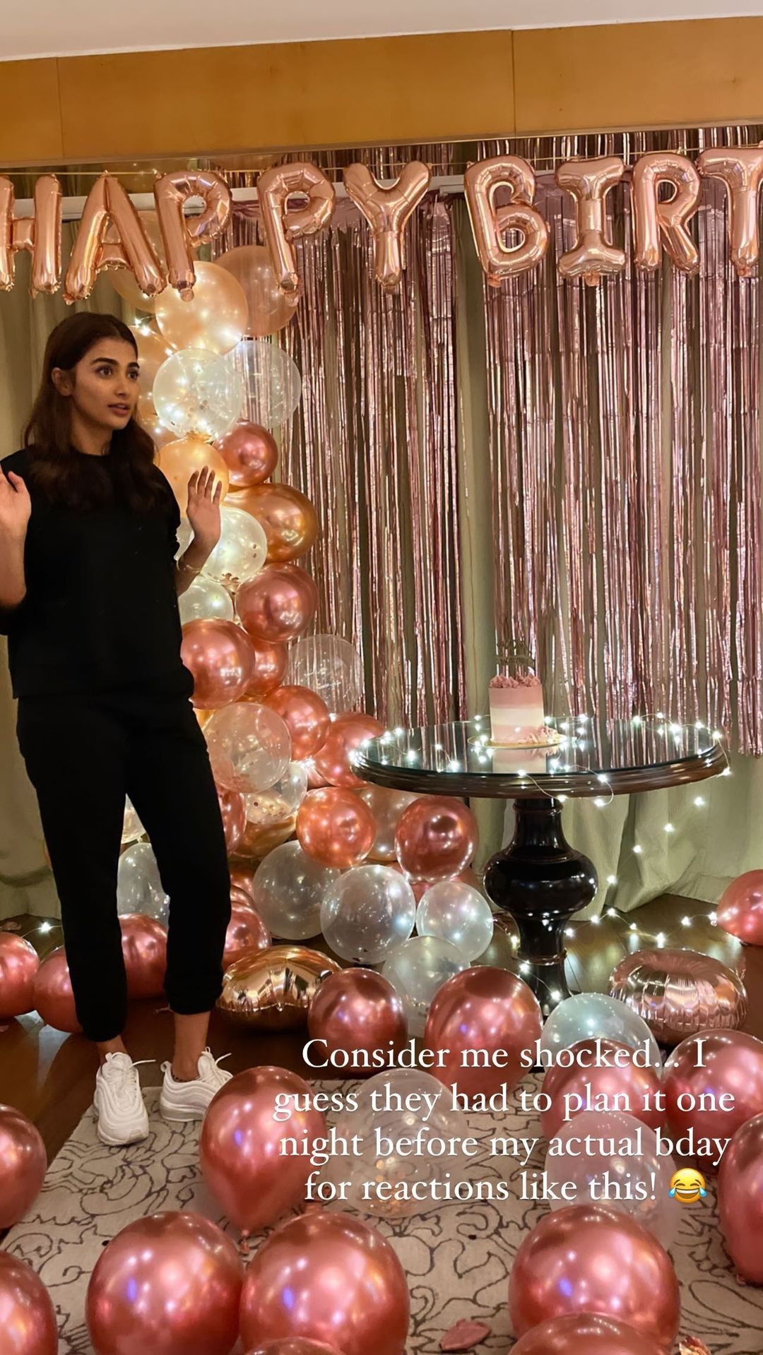 pooja hegde, a Southern and indian stunner, turn 30 today (October 13), and the birthday parties have already commenced. Pooja's reaction to the actress' team throwing a surprise pre-birthday bash is priceless. pooja hegde released a slew of photos and videos from the pre-birthday event on Instagram. pooja made the most of her birthday celebrations, from eating cake to dancing her heart out. pooja looks lovely in an all-black ensemble with jogger pants and a sweatshirt. Her crew decorated the entire area and purchased a special chocolate cake for her, which she appears to enjoy.