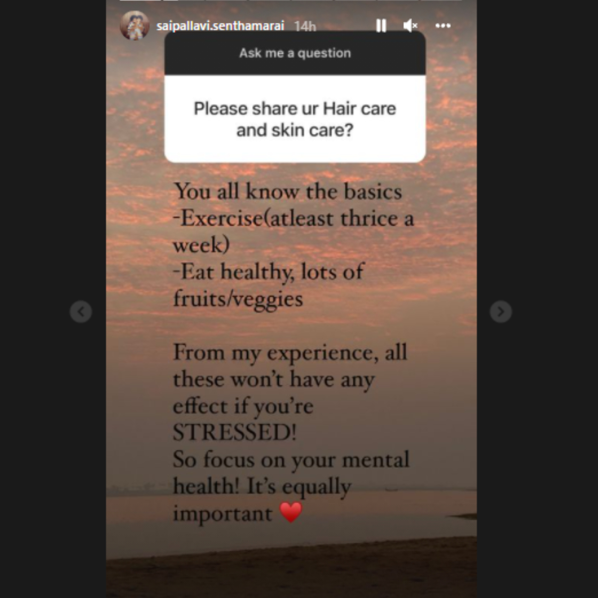 The diya starlet responded to a few fan inquiries on Insta. sai pallavi stated in response to a question on her hair and skincare routine, "You're all familiar with the fundamentals- Exercising (at least three times a week) – Consume a healthy diet rich in fruits and vegetables... All of these, in my experience, will have no effect if you are STRESSED! So pay attention to your mental wellness! It's equally crucial."