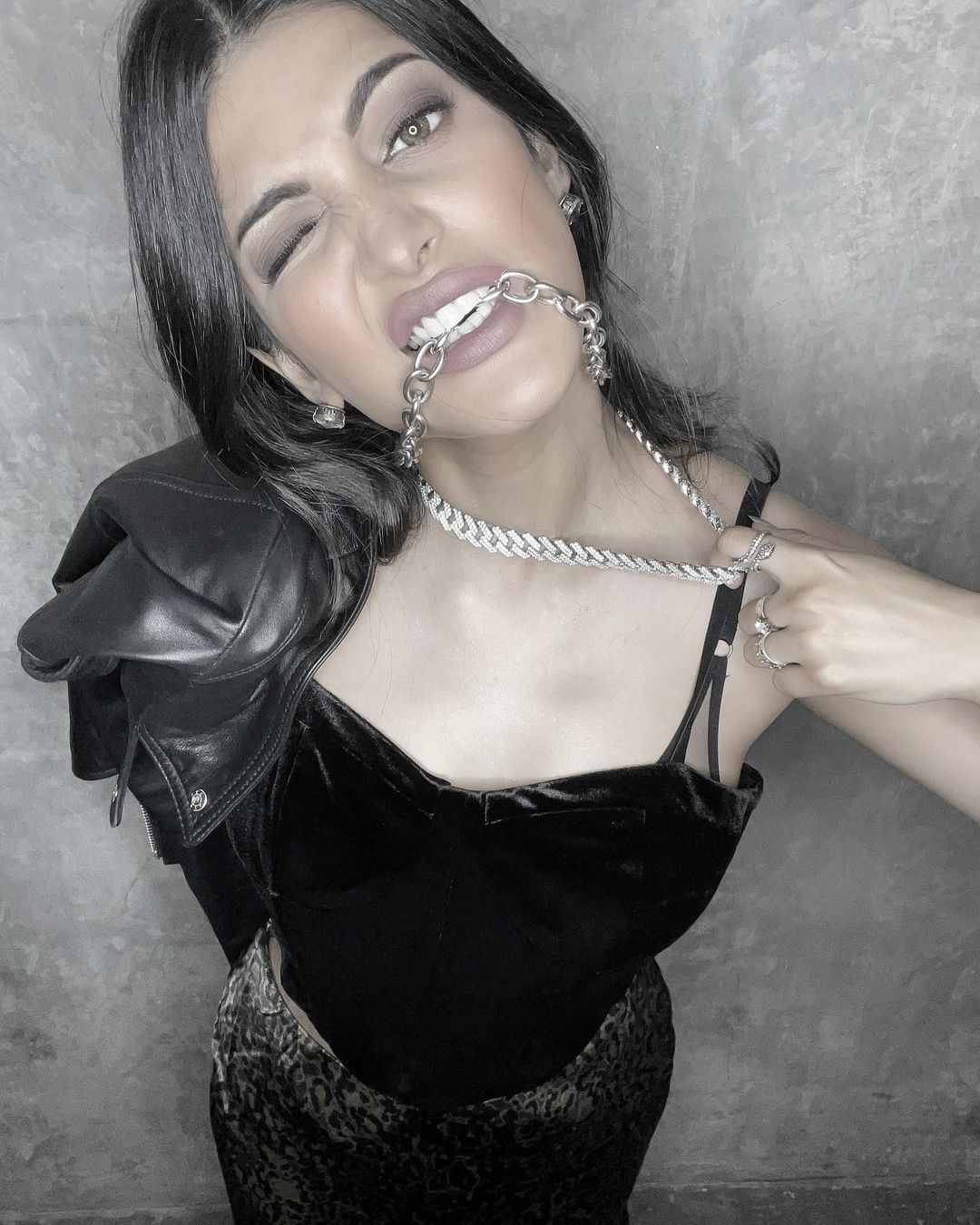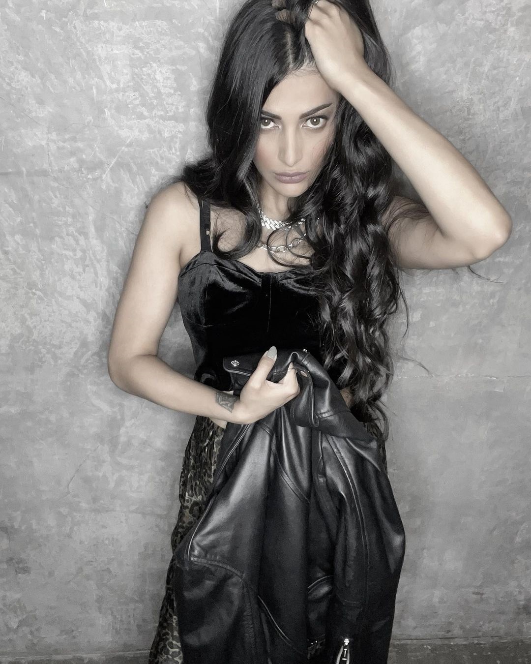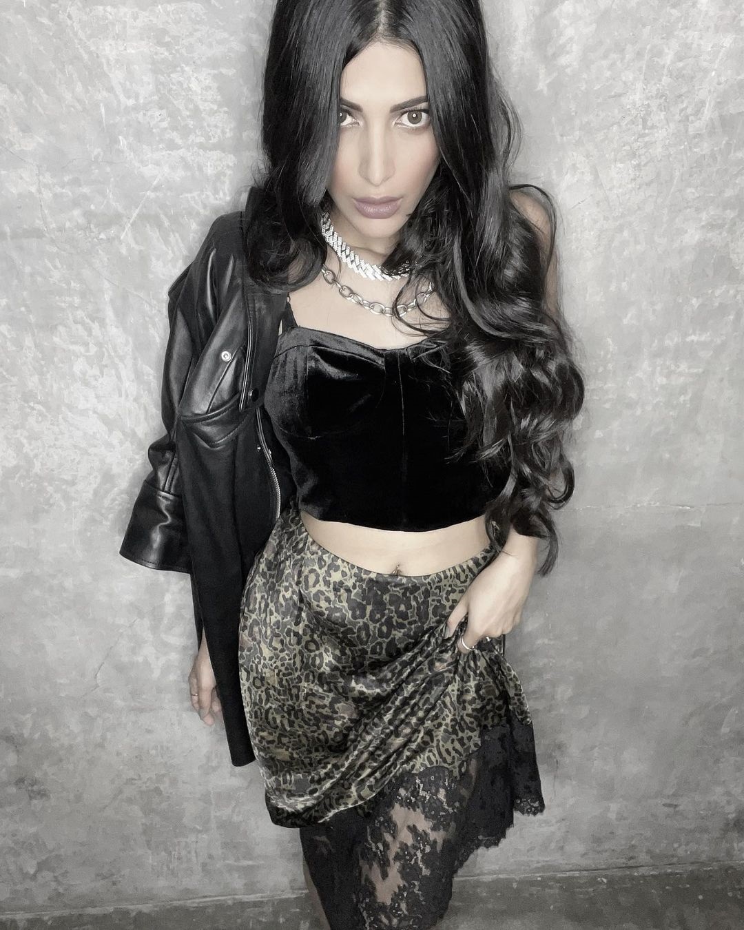 Shruti Haasan looks lovely in a leopard print lace skirts and velvet blouse, once again increasing the temperature. shruti has embellished her attire with layered jewellery and paired it with a leather jacket. Her style was complemented by soft curls, little cosmetics, and accentuated eyebrows. shruti brought a playful edge to the images by posing in unusual ways.
