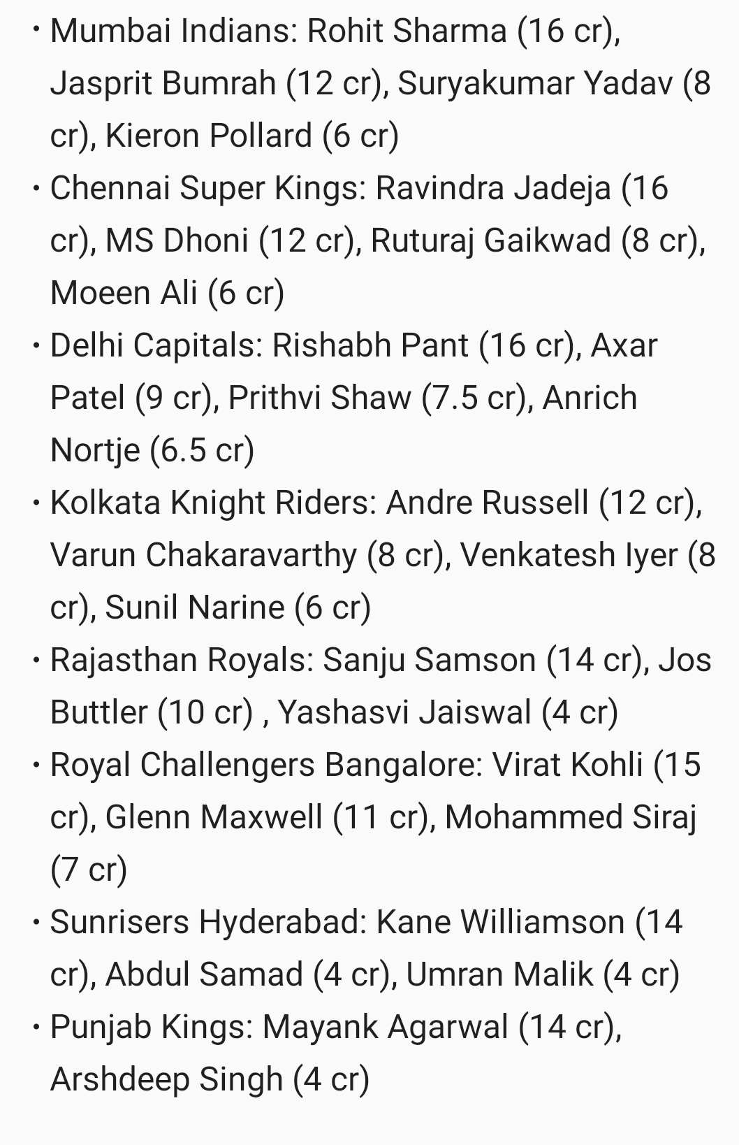 The indian five-star players who are released are KL rahul, Shreyas Iyer, Shikhar Dhawan, Chahal, and hardik Pandya. The overseas players released by the Franchises are Rashid Khan, Kagiso Rabada, David Warner, Jofra Archer, Faf Du Plessis. Head Coach Anil Kumble tried his part to convince KL rahul to be in punjab Kings but he seems to be adamant to go under the hard hammer. PBKS has around INR 72 crore left at Auction. The cost of retaining the players will be high amounts and also if they use all the four options for retention, then the amount left at auction would be INR 42 crores. It is also said ms dhoni will be retained for the three consecutive years of IPL in CSK.  Below are the IPL retained full players of each team.